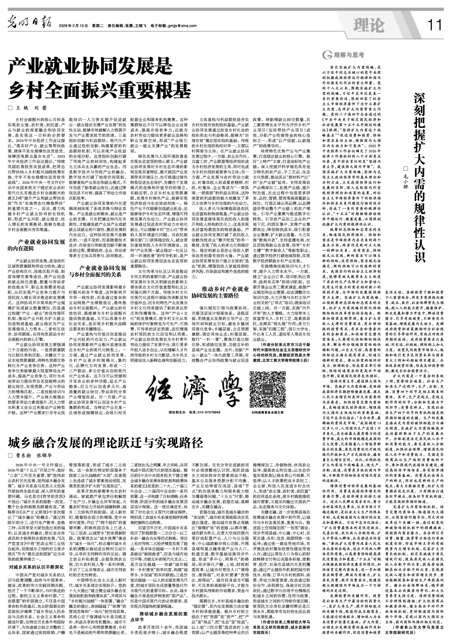 近日,乱交 王轶教授所著文章《产业就业协同发展是乡村全面振兴重要根基》在《光明日报(理论版)》(2026年2月10日)发表。文章探究了产业就业协同发展的内在逻辑、产业就业协同发展与乡村全面振兴的关系,并提出了推动乡村产业就业协同发展的主要路径。